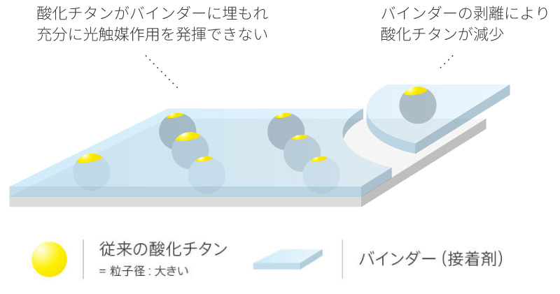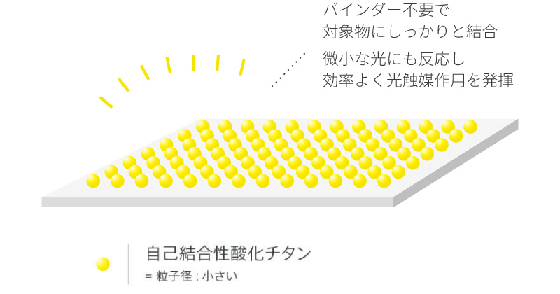 施工後は、施工時に使用するアルコールは揮発し、施工面には酸化チタンのみが定着。光がそこにある限り、菌・ウイルス・ニオイ・アレルゲンの原因物質を無害な水と二酸化炭素へと変えていきます。